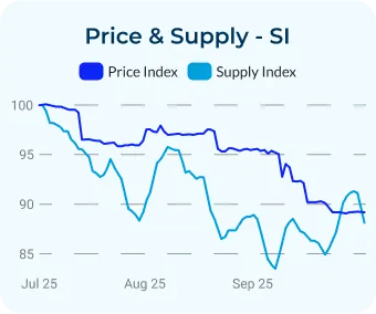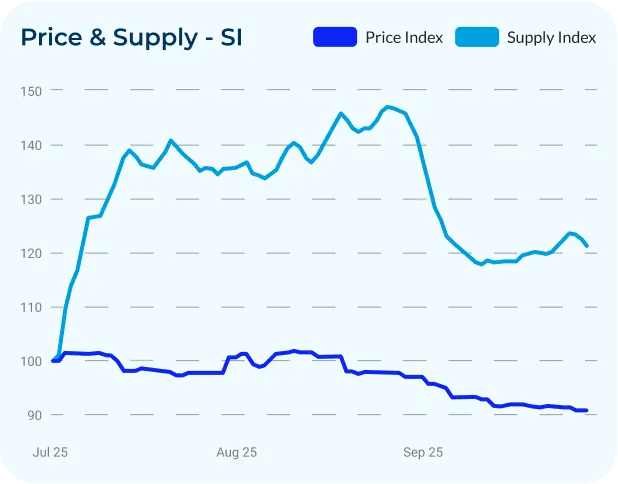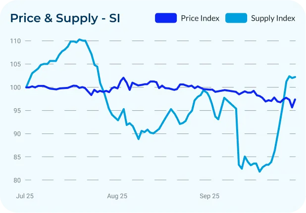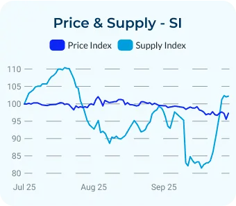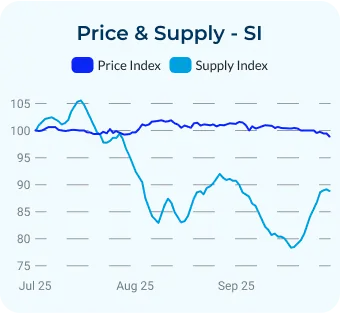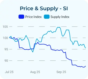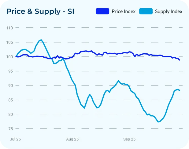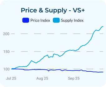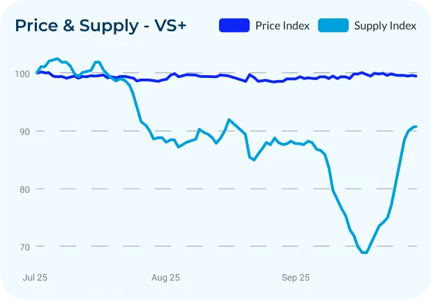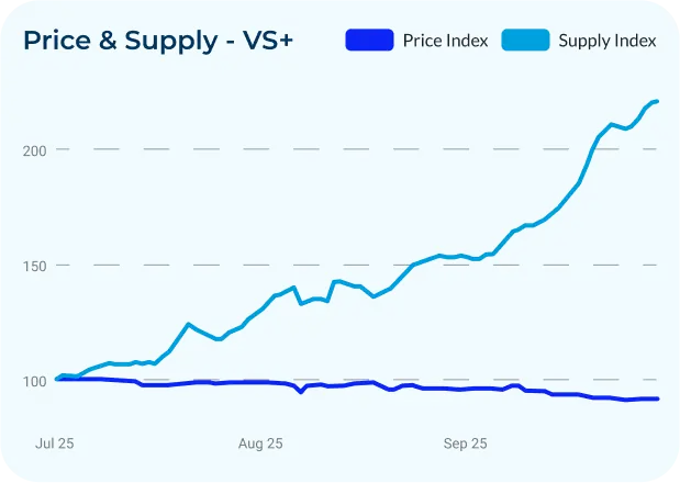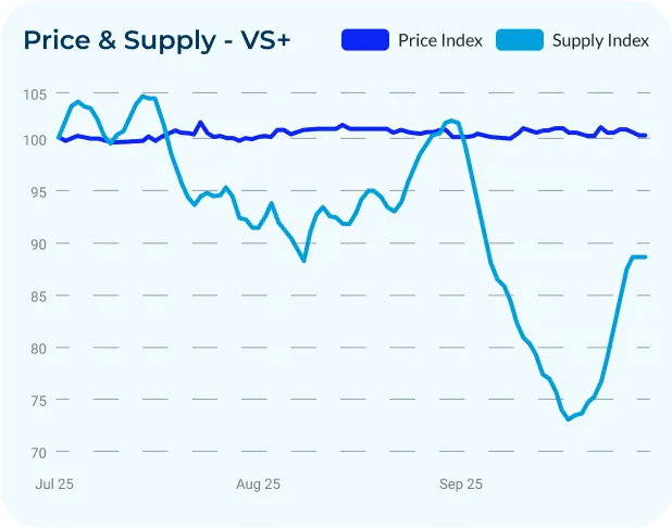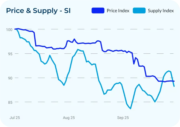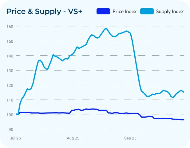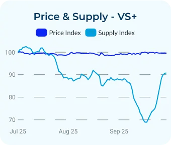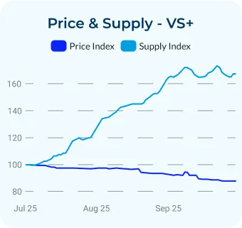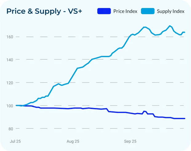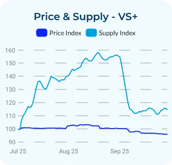 VS+ prices declined by 3.8% over the quarter. Prices briefly firmed in August before easing again through September. This is a softer performance than Q2, when VS+ slipped just 1%, and it coincided with a shift in supply from contraction last quarter to a 15.2% increase in Q3. The result mirrors the broader pattern from Q2: higher-quality goods remained relatively more resilient than SI, but they were not immune to renewed pressure.