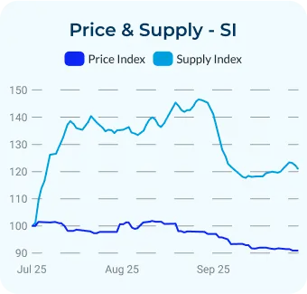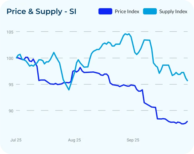 SI prices fell by 9% for the quarter, a sharper drop than the 3.9% decrease recorded in Q2. Pricing trended lower from July onward without a meaningful rebound, while supply rose 21% after contracting in Q2. Together, these moves reinforce the structural demand weakness in lower-clarity goods that has persisted across consecutive quarters.