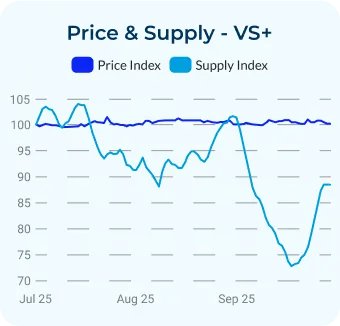 VS+ stones fell by 11.4% during the quarter. Prices decreased consistently from early July, showed a brief pause in mid-August, and then resumed their downward trend into late September. Supply of certified goods rose by 64%, reinforcing the weakness in pricing.