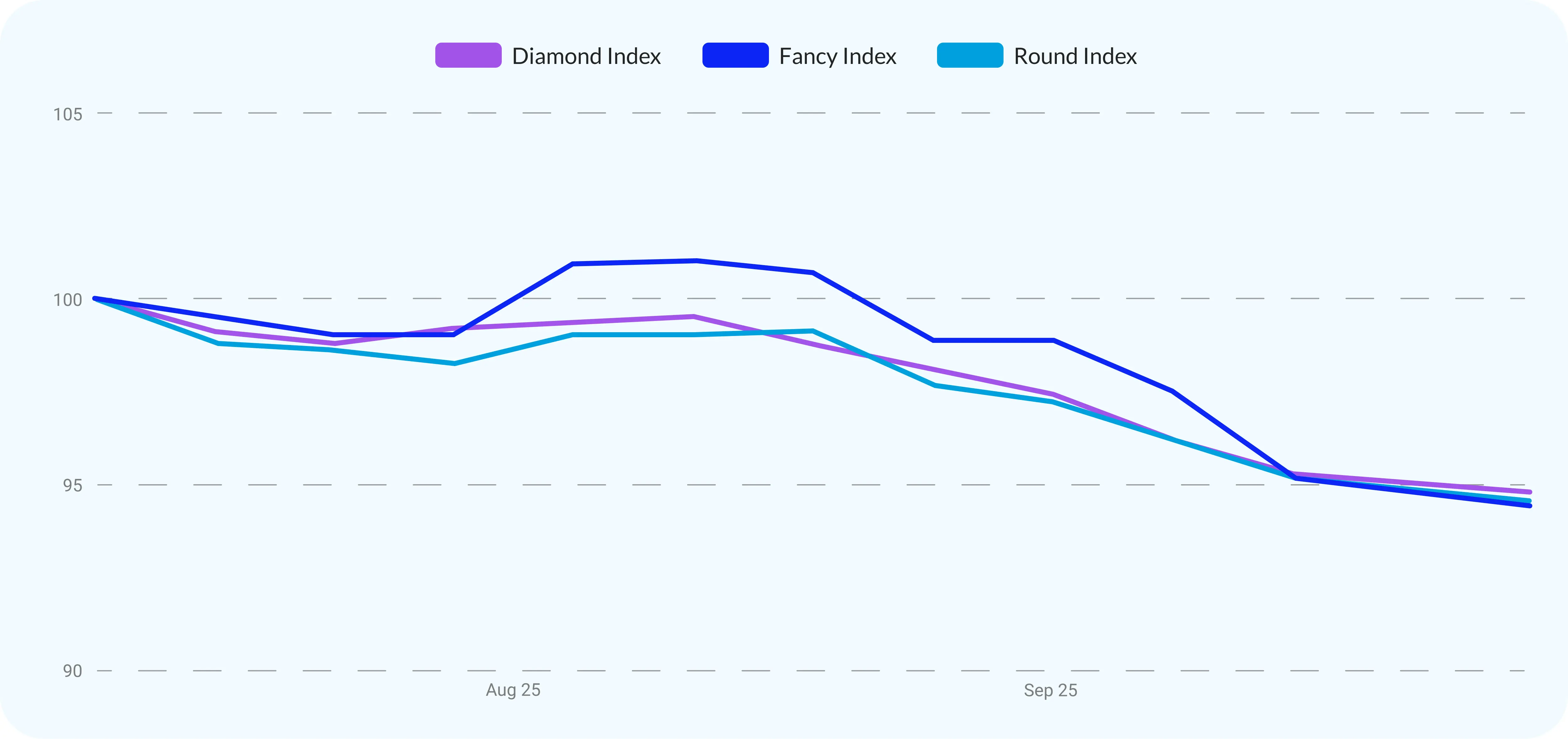 Q3 2025 marked a decisive shift in the diamond market, moving from stability in the first half of the year to a sharper correction. The Diamond Index fell 5.23% in the quarter, bringing the year-to-date decline to 9.24%, a clear acceleration from the modest 3.4% drop recorded at the end of Q2. The introduction of higher U.S. tariffs (50%) on Indian polished goods in late August was the key driver, pushing prices lower into September and reshaping sourcing patterns across major trading hubs.